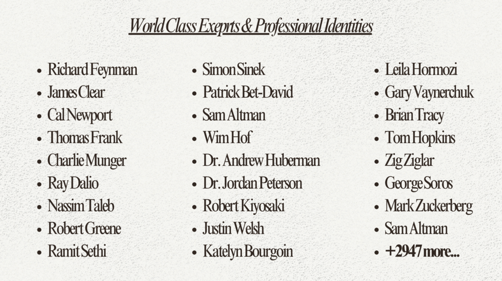 You're getting 3,000+ world's top expert - identities across 300+ industries — the legends who've already mastered what you're trying to build:
